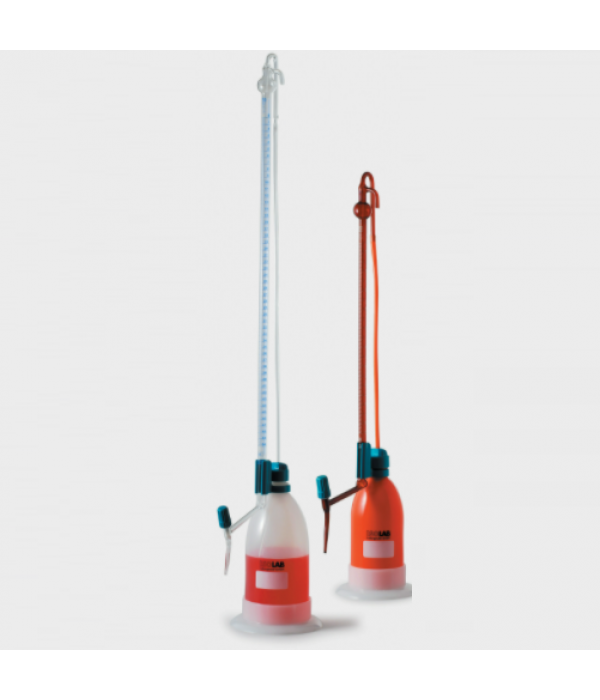 - Buret 10ml có bình chứa polyetylen thể tích 500ml trong khi buret 25 ml và 50ml được sử dụng với bình có thể tích 1000ml.